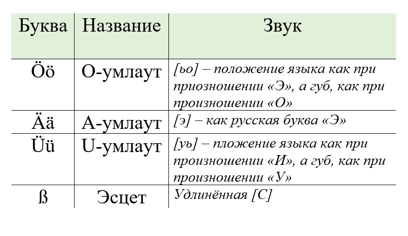 Здесь Вашему вниманию представлена таблица с правилами правильного произношения умлаутов в немецком языке.