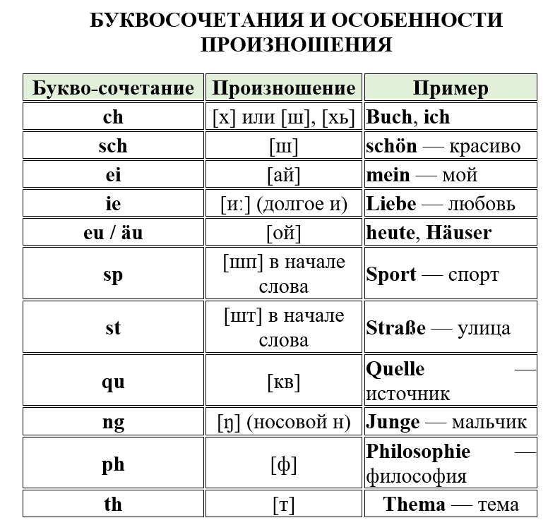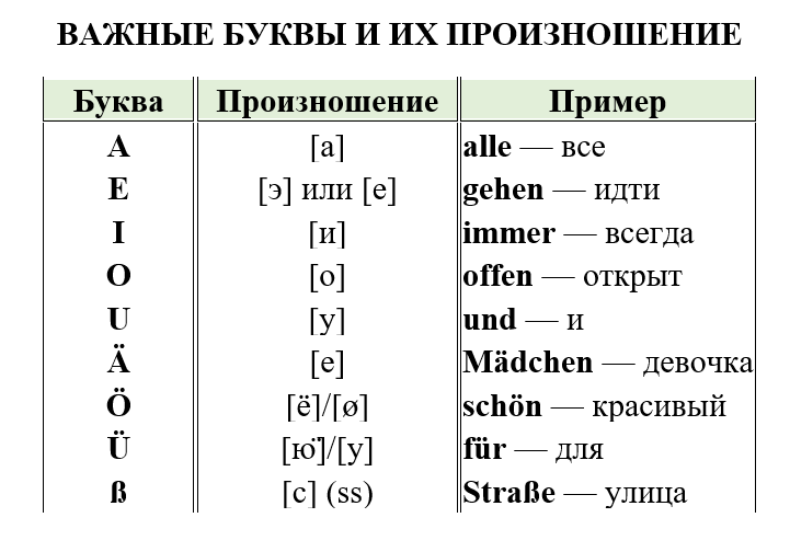 Ниже представлены основные правила чтения на немецком языке с пример